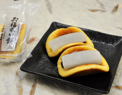 北海道産の良質な小豆で作った自慢の餡をどらやきの皮で包み、もちをのせたしっとりした和菓子です。